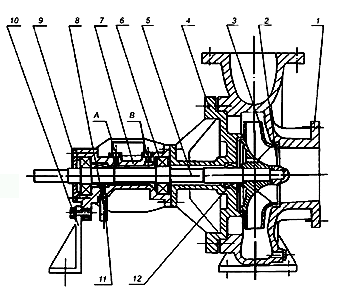 RY型熱油泵為單級懸臂式結構分為腳支撐和中心支撐,泵的進口為軸向吸入,出口為中心垂直向上。泵和驅動電機通過彈性聯(lián)軸器合裝于同一底座上。整個機組無需加冷系統(tǒng)。